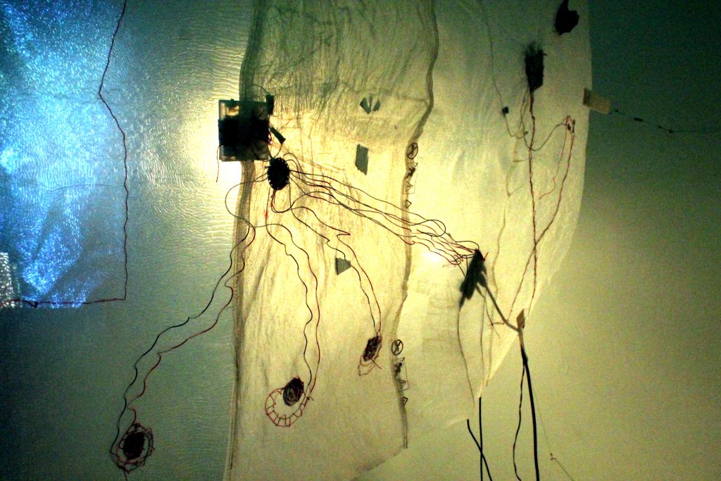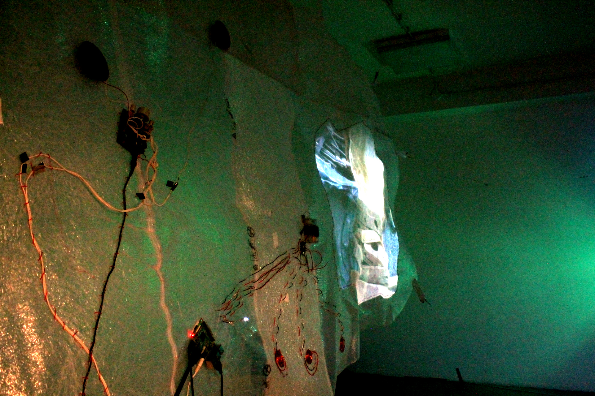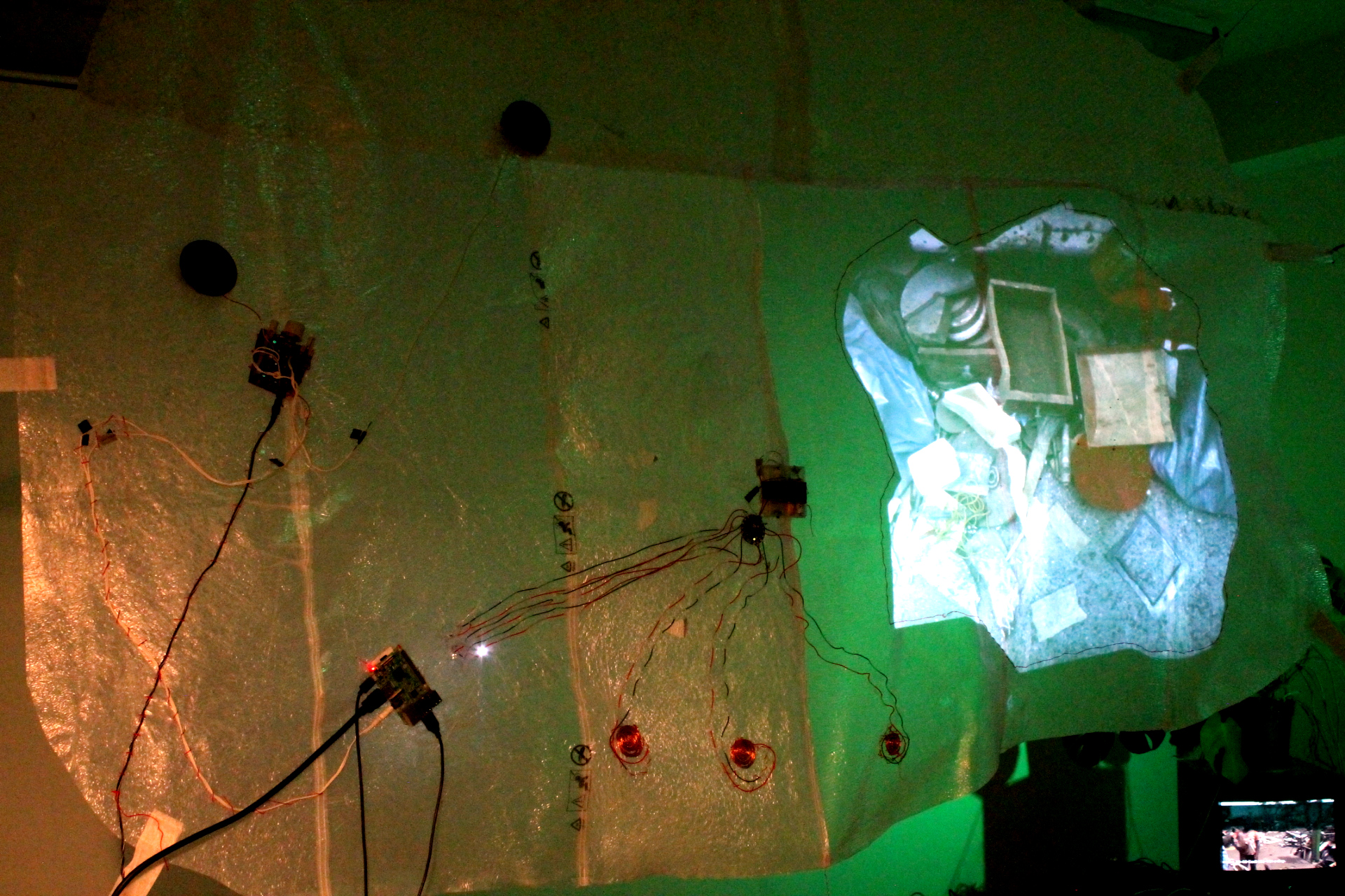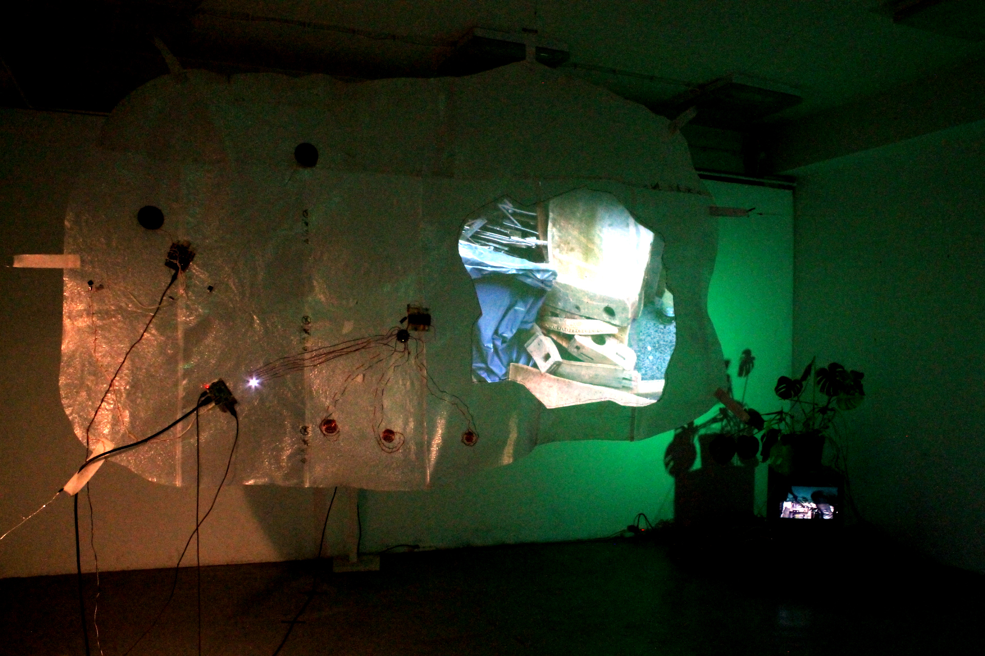 To build the installation, I used UTOPLAST as a base, an upcycled plastic I make by fusing waste plastic bags. I designed and built interactive circuitry and audiovisual feedback into the surface of the 1*2m UTOPLAST, which thus became an interface to provide a window into the experiences of lomi people. I replicated the cable stripping practice to use copper for capacitive sensing. I used an Adafruit Flora microcontroller and a Raspberry Pi minicomputer, the production of both of which relies on conflict minerals. Except for these two elements, all other components of the installation were either recycled from discarded objects or found on-site. The installation consists of a »main« and a »side« assemblage. The main assemblage is the interactive circuit built into the material of the upcycled plastic, on which touch activates the audiovisual traces of interviews made with lomi people. The other assemblage consists of an old television and a media player, discarded cables, and of a huge monstera plant with gigantic air roots. The TV plays a mashup of reports about people surviving off scavenging at toxic waste sites in China and Africa. In my working methodology, both hacking for hedonism and hacking for survival are present, similar to how Hungary is at an intersection of different paradigms regarding attitudes and practices towards supply chains of waste. The title of the work is the translation of a line from one of the interviews.